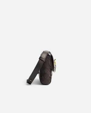 Mini Intrecciato leather cross-body bag with metallic knot closure. Product details • Mini Intrecciato leather cross-body bag with metallic knot closure • One internal zipped pocket • Metal knot closure Material: 100% Lambskin • Lining: Calfskin • Color: Barolo • Hardware: Muse brass finish • Height: 13.5 cm | 5.3" • Width: 21.5 cm | 8.5" • Depth: 4.5 cm | 1.8" • Strap drop: 47 cm | 18.5"