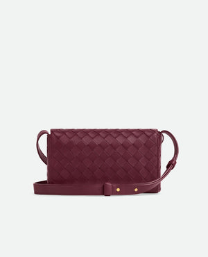 Mini Intrecciato leather cross-body bag with metallic knot closure. Product details • Mini Intrecciato leather cross-body bag with metallic knot closure • One internal zipped pocket • Metal knot closure Material: 100% Lambskin • Lining: Calfskin • Color: Barolo • Hardware: Muse brass finish • Height: 13.5 cm | 5.3" • Width: 21.5 cm | 8.5" • Depth: 4.5 cm | 1.8" • Strap drop: 47 cm | 18.5"