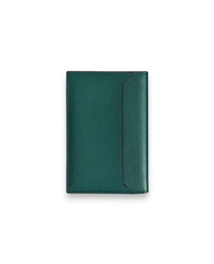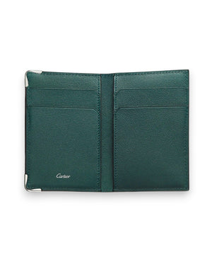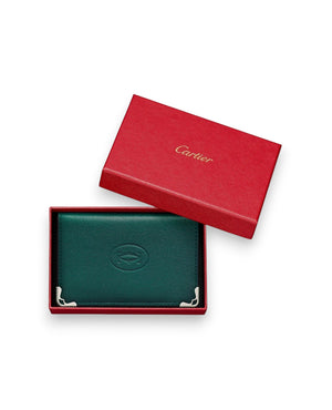 Green calfskin 4-credit card holder. Exterior: embossed double C logo, stainless steel metal corners. Interior: Green calfskin, silver-coloured CRTmarking, four credit card pockets, three flat pockets. Dimensions: 107 mm high x 71 mm wide.