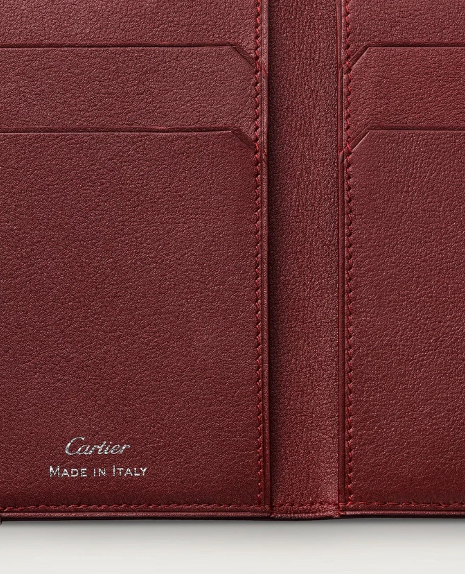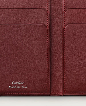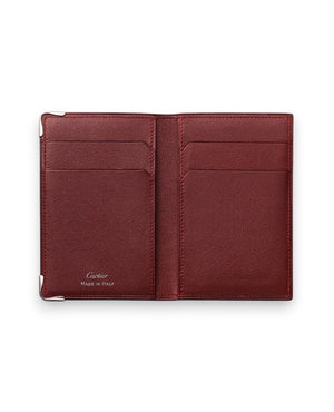 Black calfskin 4-credit card holder. Exterior: embossed double C logo, stainless steel metal corners. Interior: burgundy calfskin, silver-coloured CRTmarking, four credit card pockets, three flat pockets. Dimensions: 107 mm high x 71 mm wide. This model may be made in Italy or Portugal.