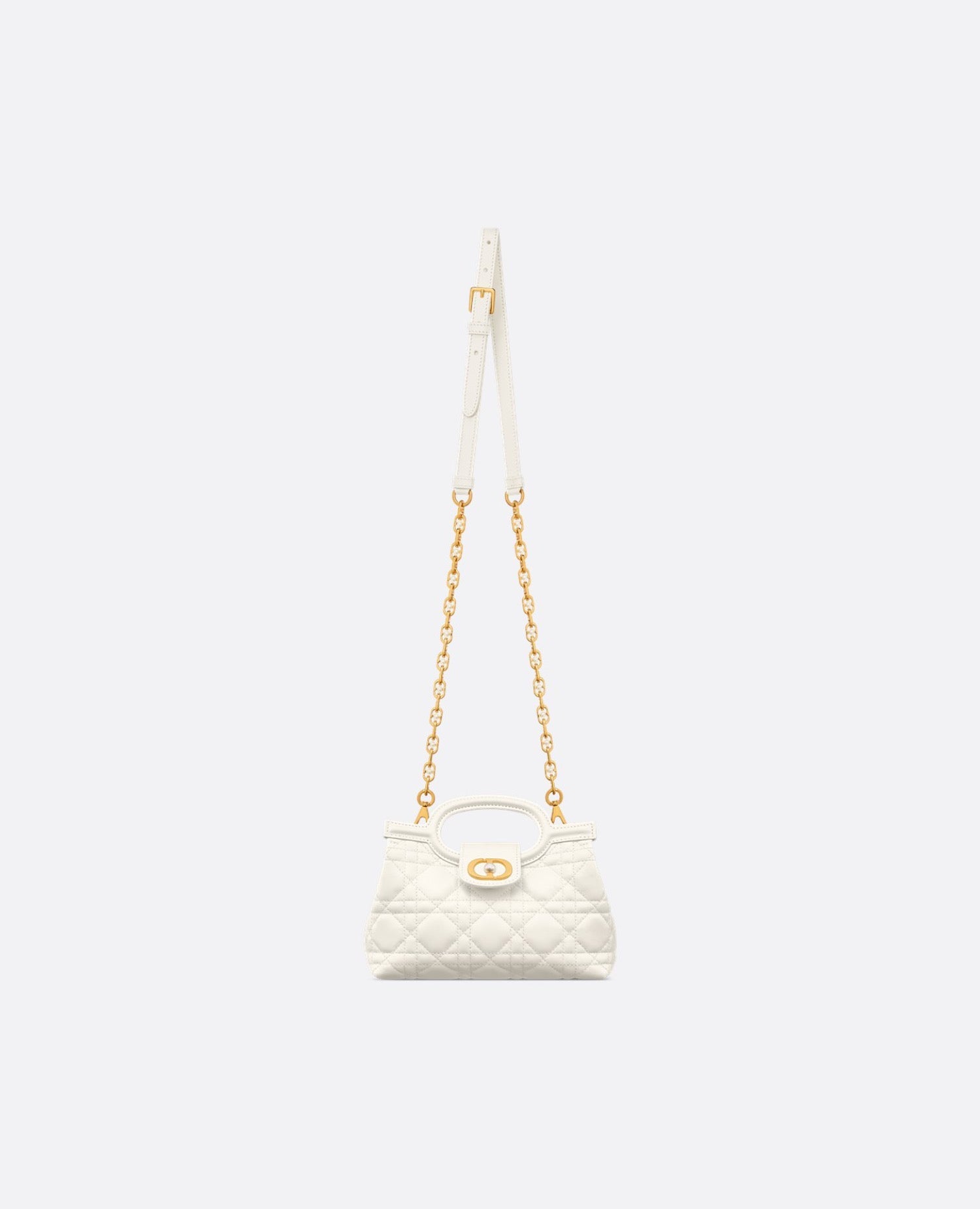 New for Cruise 2026, the DR Jolie Top Handle mini bag presents an elegant and refined design. Crafted in latte Cannage lambskin, the style features a flap, enhanced by a gold-finish metal CD signature with a white resin pearl, that opens to reveal a compartment to accommodate all the essentials. The double top handle, complete with an adjustable and removable CD chain strap accented by white resin pearls and a leather insert, allows the bag to be comfortably carried by hand, worn over the shoulder or crossbody, day or evening.