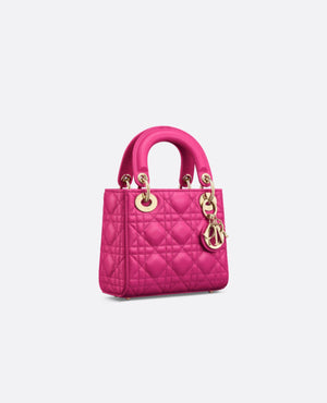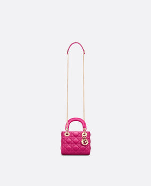 The Lady DR bag epitomizes the House's vision of elegance and beauty. Sleek and refined, the timeless style is crafted in fuchsia lambskin with Cannage stitching, creating the unmistakable quilted texture. Pale gold-finish metal D.I.O.R. charms embellish and illuminate its silhouette. Featuring a removable chain strap, the miniature Lady DR bag can be carried by hand or worn crossbody as an ideal evening wear companion.
