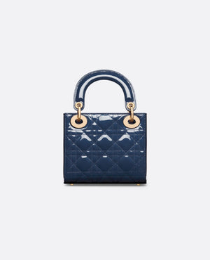 The Lady DR bag epitomizes the House's vision of elegance and beauty. Sleek and refined, the style is timeless. It is crafted in deep ocean blue patent calfskin with Cannage stitching, creating the legendary and instantly recognizable quilted texture. The pale gold-finish metal signature D.I.O.R. charms embellish and illuminate its silhouette. Featuring a removable chain shoulder strap, the miniature Lady DR bag can be carried by hand or worn crossbody as an ideal evening wear companion.