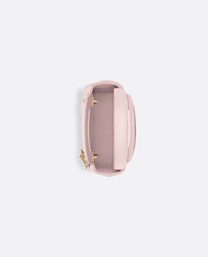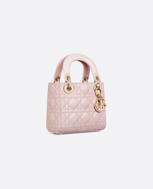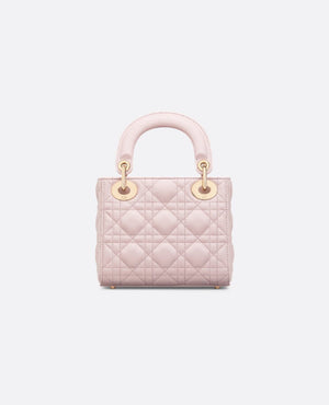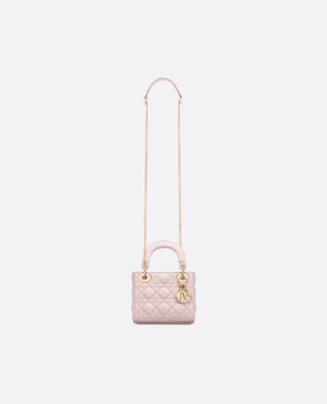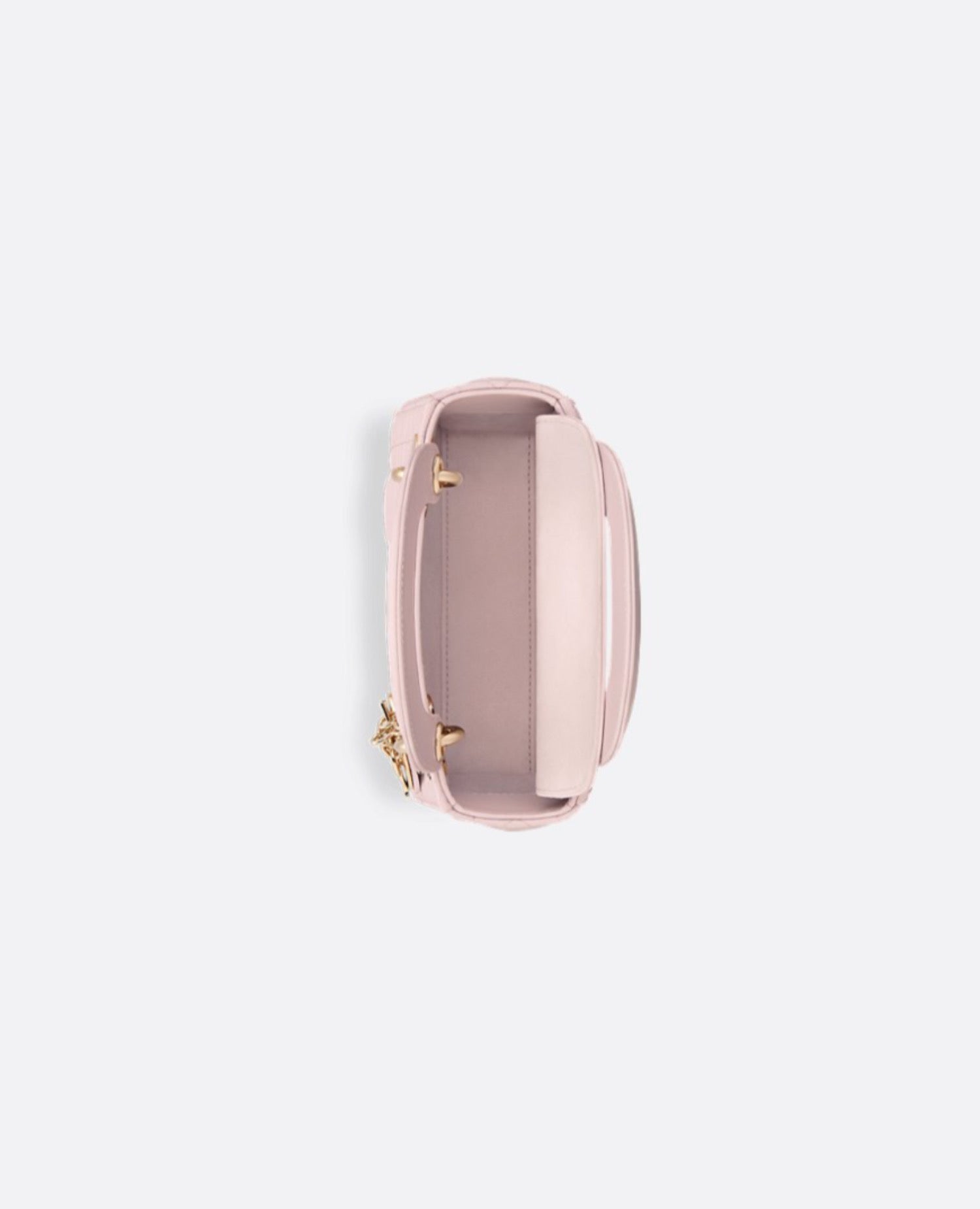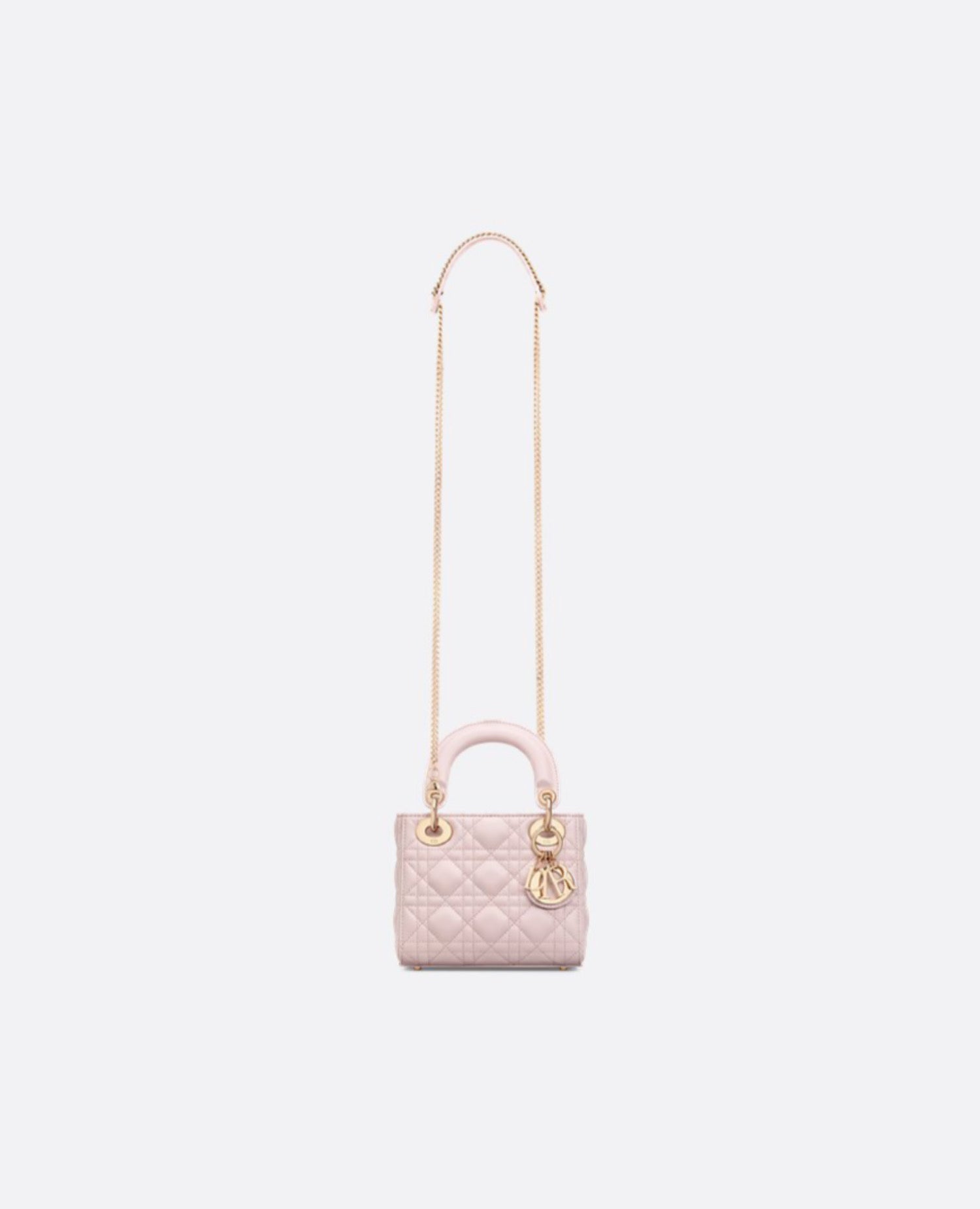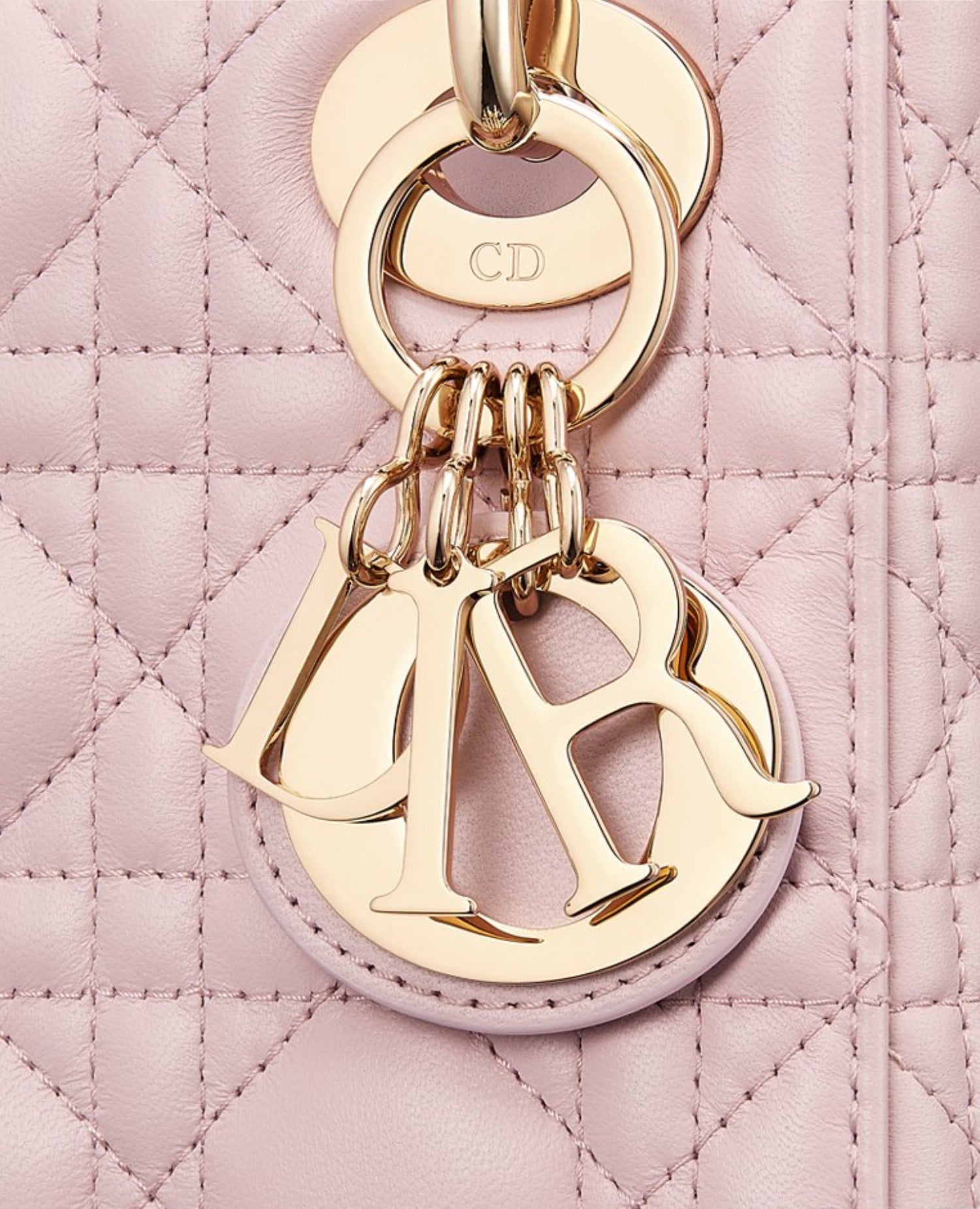 The Lady DR bag epitomizes the House's vision of elegance and beauty. Sleek and refined, the timeless style is crafted in pale pink lambskin with Cannage stitching, creating the legendary and instantly recognizable quilted texture, while pale gold-finish metal D.I.O.R. charms further embellish its silhouette. Featuring a removable chain shoulder strap, the miniature Lady DR bag can be carried by hand or worn crossbody as an ideal evening companion.