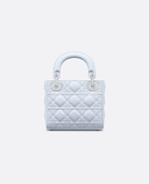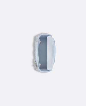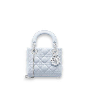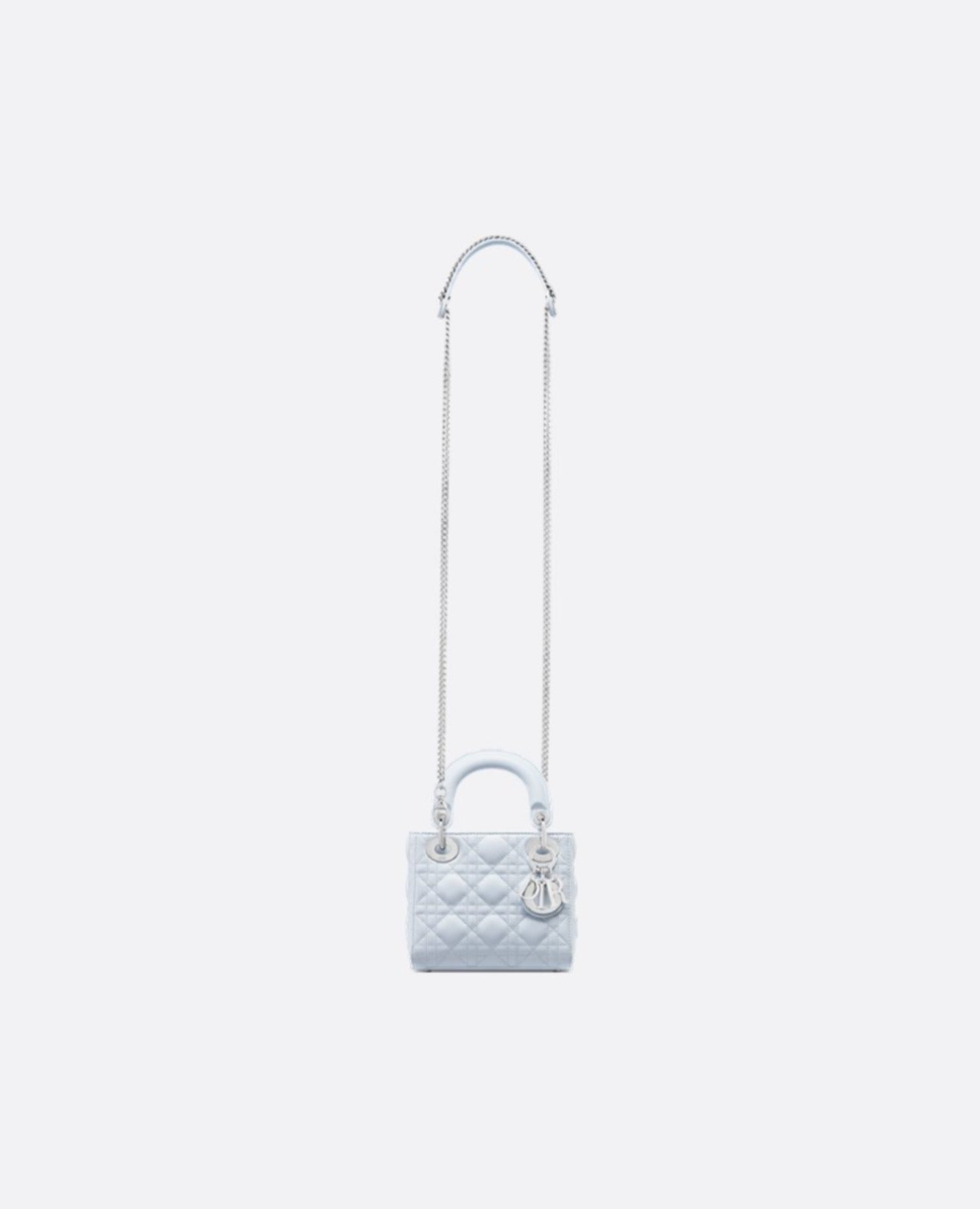 The Lady DR bag epitomizes the House's vision of elegance and beauty. Sleek and refined, the timeless style is crafted in shirt blue lambskin with Cannage stitching, creating the unmistakable quilted texture. Silver-finish metal D.I.O.R. charms embellish and illuminate its silhouette. Equipped with a removable chain strap, the miniature Lady DR bag can be carried by hand or worn crossbody as an ideal evening wear companion.
