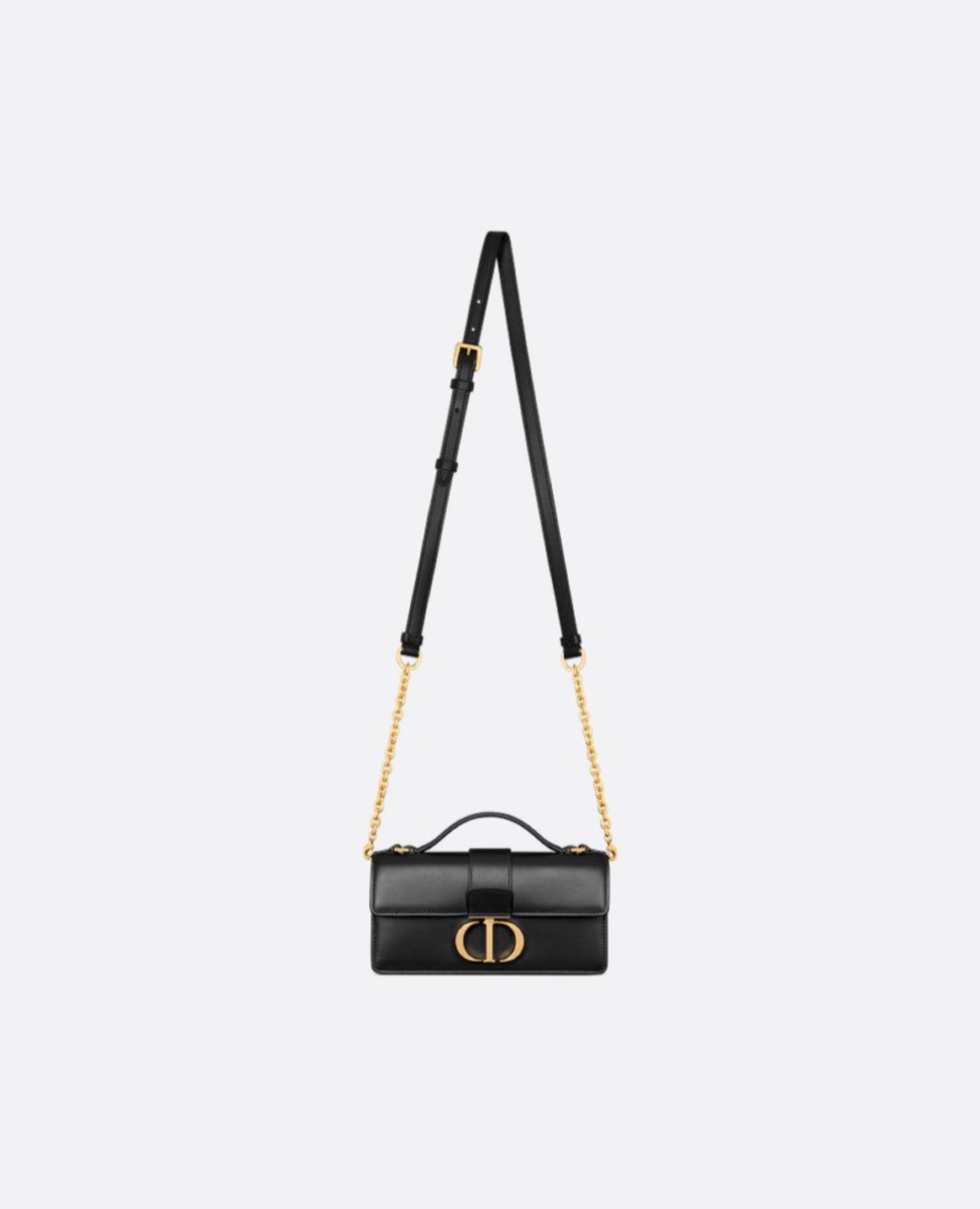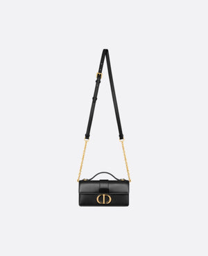 The Miss Montaigne mini bag is a practical and elegant style. Crafted in black smooth calfskin, it features a flap embellished with an antique gold-finish metal CD twist clasp inspired by the seal of a DR perfume bottle, revealing a compartment to hold all the essentials. Equipped with a top handle and adjustable chain strap with a leather insert, the bag can be comfortably carried by hand, worn over the shoulder or crossbody as an ideal daily companion.
