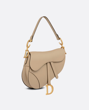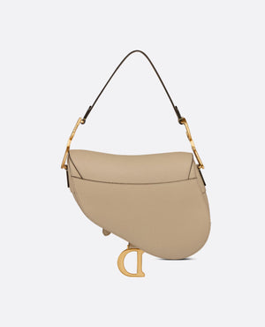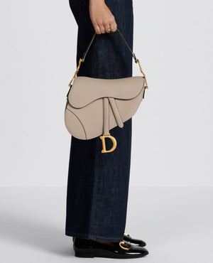 Maria Grazia Chiuri brings a fresh update to the iconic Saddle bag. Crafted in sand-colored grained calfskin, the legendary design features a Saddle flap with a D stirrup strap and magnetic pull, as well as an antique gold-finish metal CD signature on either side of the handle. Equipped with a thin, adjustable and removable strap, the Saddle bag may be carried by hand, worn over the shoulder or crossbody.