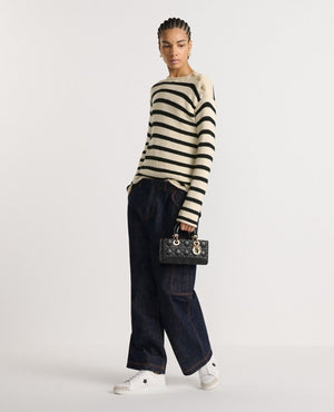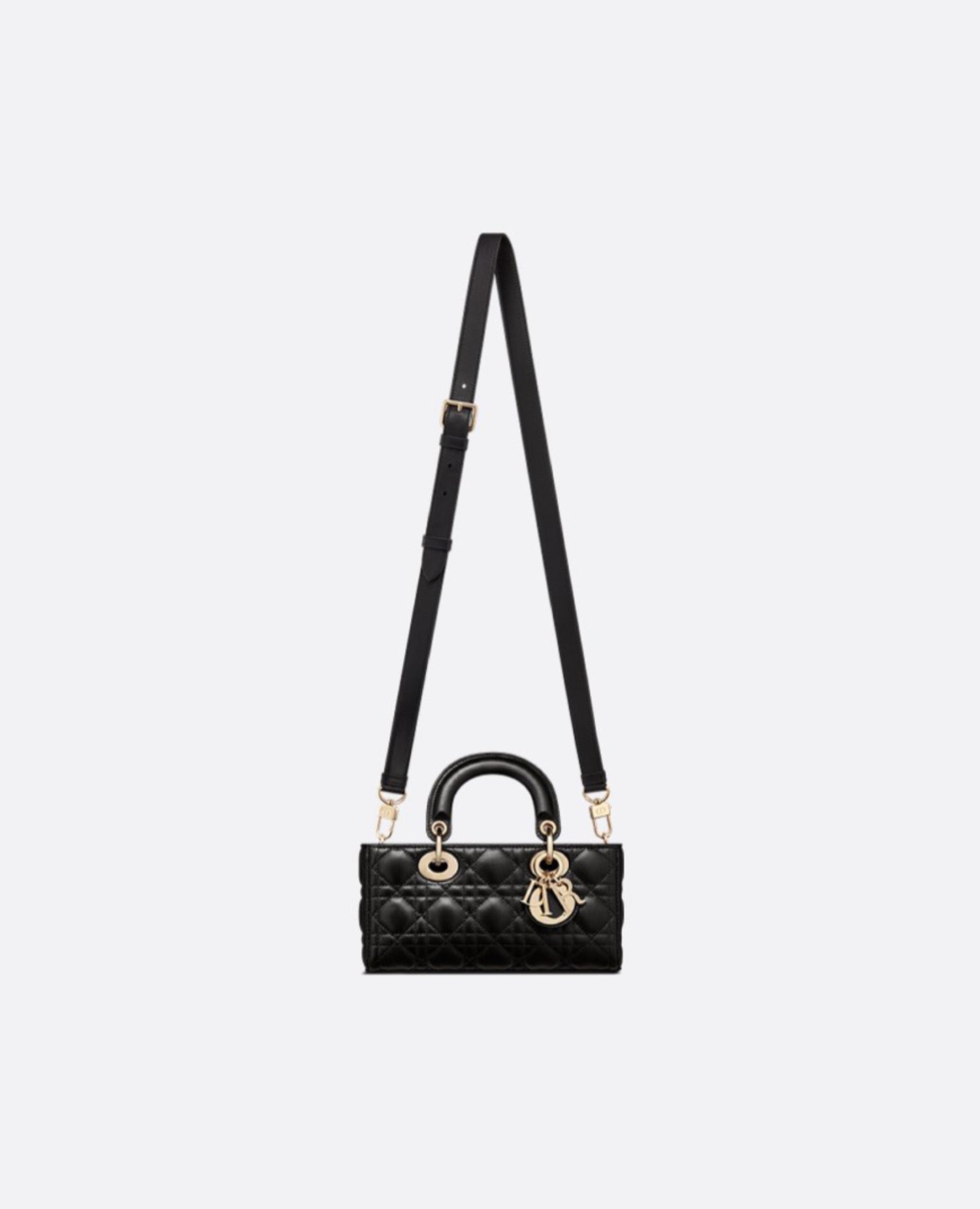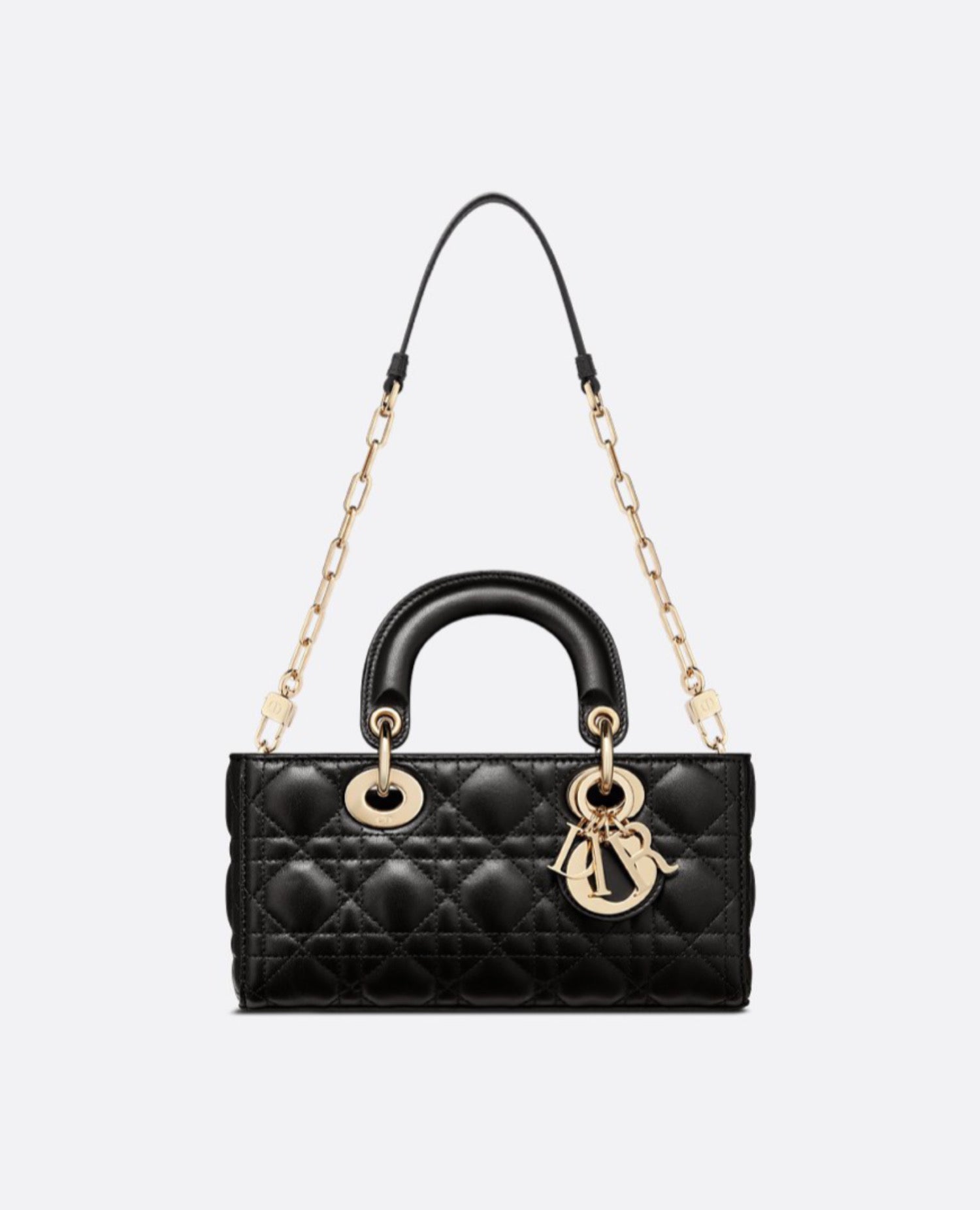 The Lady D-Joy bag captures the House's vision of elegance and beauty by showcasing the iconic streamlined aesthetic of the Lady DR line. Crafted in black lambskin with Cannage stitching, the refined and timeless style is enhanced by pale gold-finish metal D.I.O.R. charms illuminating its silhouette. Featuring one detachable chain strap and another adjustable and removable leather strap, the small Lady D-Joy bag can be carried by hand, worn over the shoulder or crossbody as a daily companion.