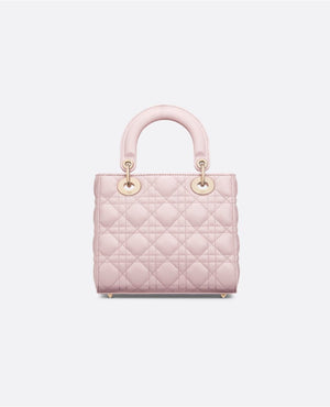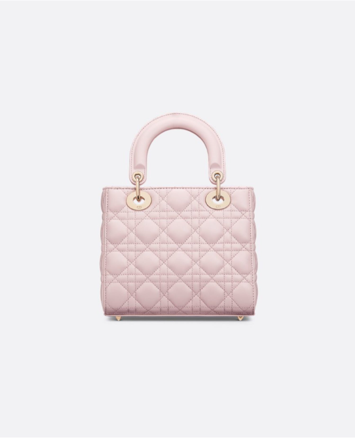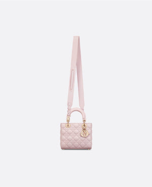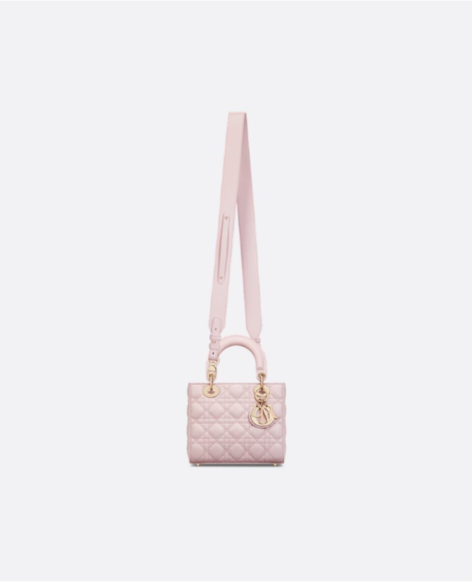 The Lady DR My ABCDR bag epitomizes DR's vision of elegance and beauty. Sleek and refined, the timeless style is crafted in pale pink lambskin with Cannage stitching, creating the unmistakable quilted texture. Pale gold-finish metal D.I.O.R. charms offer elegant appeal. Featuring a strap that can be personalized with symbolic badges, the small, unique design may be carried by hand or worn crossbody.