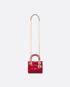 The Lady DR bag epitomizes the House's vision of elegance and beauty. Sleek and refined, the style is timeless. It is crafted in cherry red patent calfskin with Cannage stitching, creating the legendary and instantly recognizable quilted texture, while the pale gold-finish metal D.I.O.R. charms further embellish its silhouette. Featuring a removable chain shoulder strap, the miniature Lady DR bag can be carried by hand or crossbody as an ideal evening wear companion.