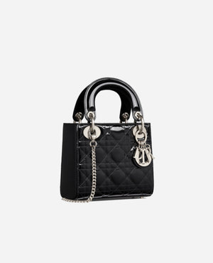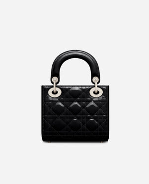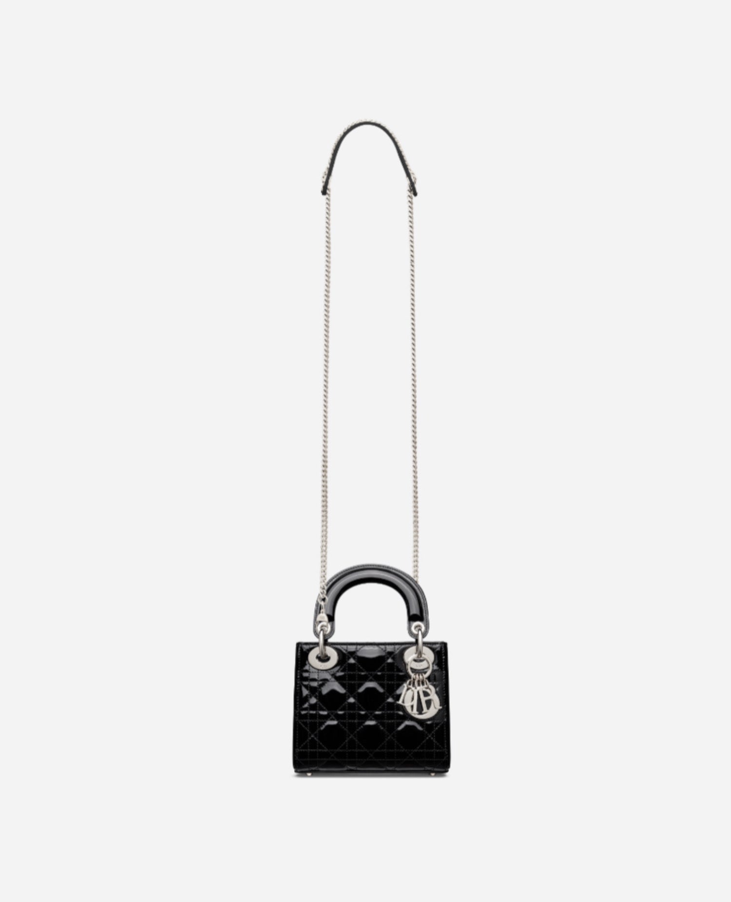 The Lady DR bag epitomizes the House's vision of elegance and beauty. Sleek and refined, the timeless style is crafted in black patent calfskin with Cannage stitching, creating the legendary and instantly recognizable quilted texture, while the pale Silver-finish metal D.I.O.R. charms further embellish its silhouette. Featuring a removable chain strap, the miniature Lady DR bag can be carried by hand or crossbody as an ideal evening wear companion.