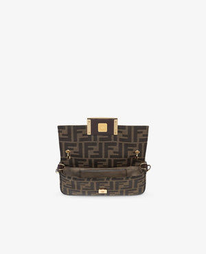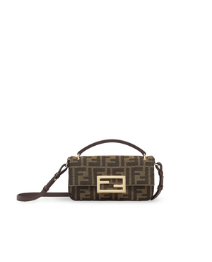 Baguette smartphone pouch with front flap and FF magnetic button closure. Small handle, adjustable and removable shoulder strap. Made of fabric with brown jacquard FF motif. Metal accessories in a vintage-gold finish.