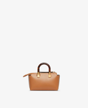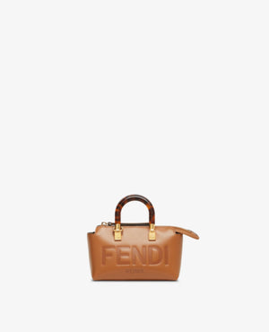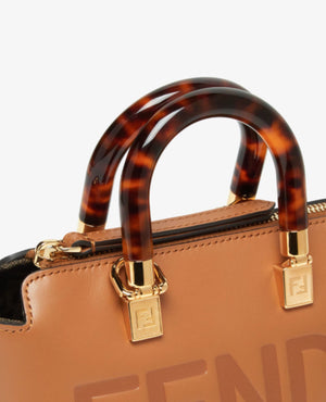 Iconic mini By The Way Boston bag made of brown leather with hot-stamped FND ROMA lettering and rigid tortoiseshell-effect plexiglass handles. Zip fastening.