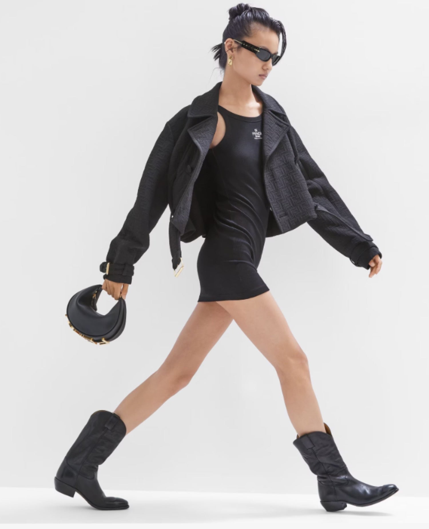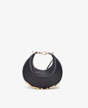 Mini hobo bag made of soft black leather, embellished with vintage gold metal FND lettering.