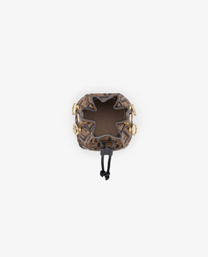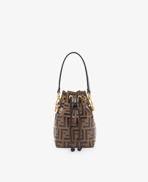 Small Mon Tresor bucket bag with drawstring closure and metal details in the FND logo shape. Two removable shoulder straps, one short and one long, allow the bag to be carried in the hand, on the shoulder or cross-body. Made of brown calf leather. Iconic embossed and hand-painted black FF motif. Metal details with a gold finish.