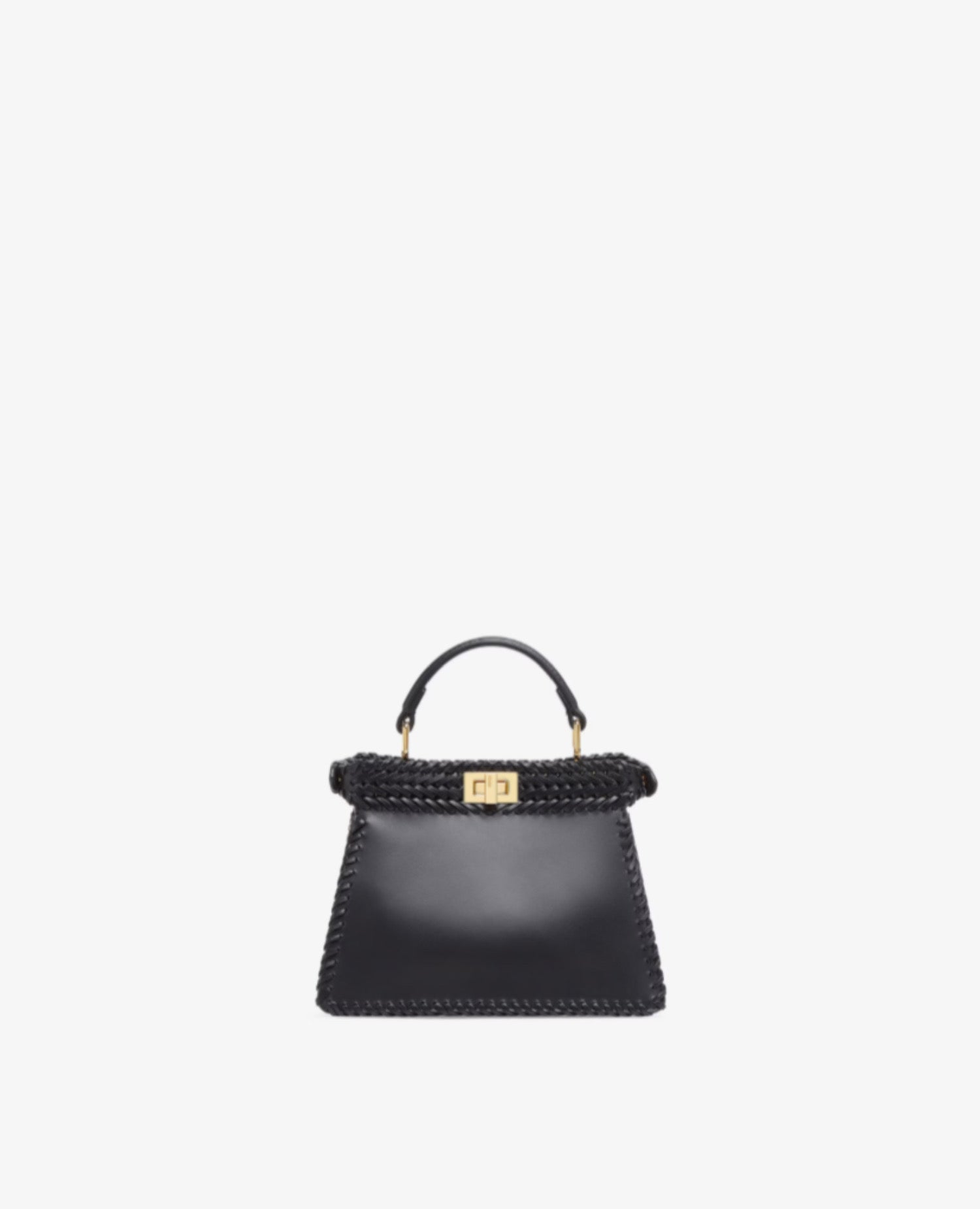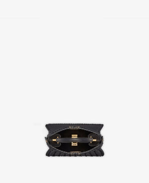 Iconic Peekaboo ISeeU bag in an ideal, compact size. Made of black leather with borders and front panel embellished by a hand-crafted tone-on-tone interlace. Decorated with the iconic twist lock on both sides.