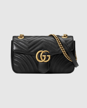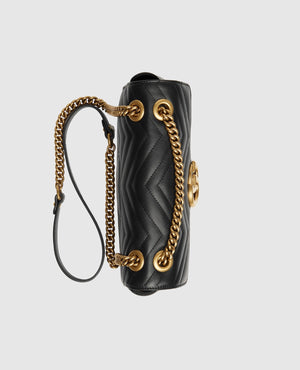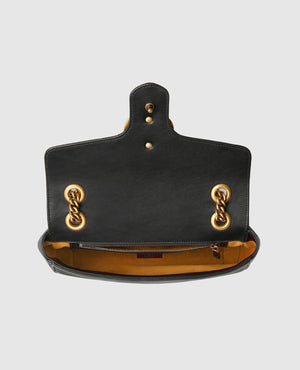 The small GG Marmont camera bag has a softly structured shape and a flap closure with Double G hardware. The sliding chain strap can be worn multiple ways, changing between a shoulder and a top handle bag. Made in matelassé chevron leather with a heart on the back.