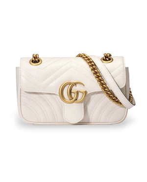 Made in matelassé chevron leather in a neutral shade of light beige, the now recognizable GG Marmont mini bag has a softly structured shape and a flap closure with Double G hardware. Designed to be worn multiple ways, the chain strap slides to change between a shoulder and a top handle bag.