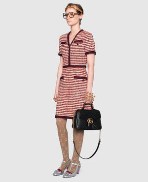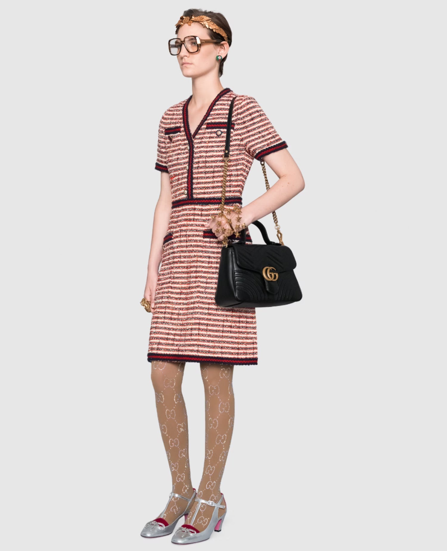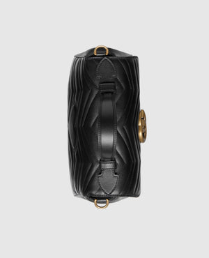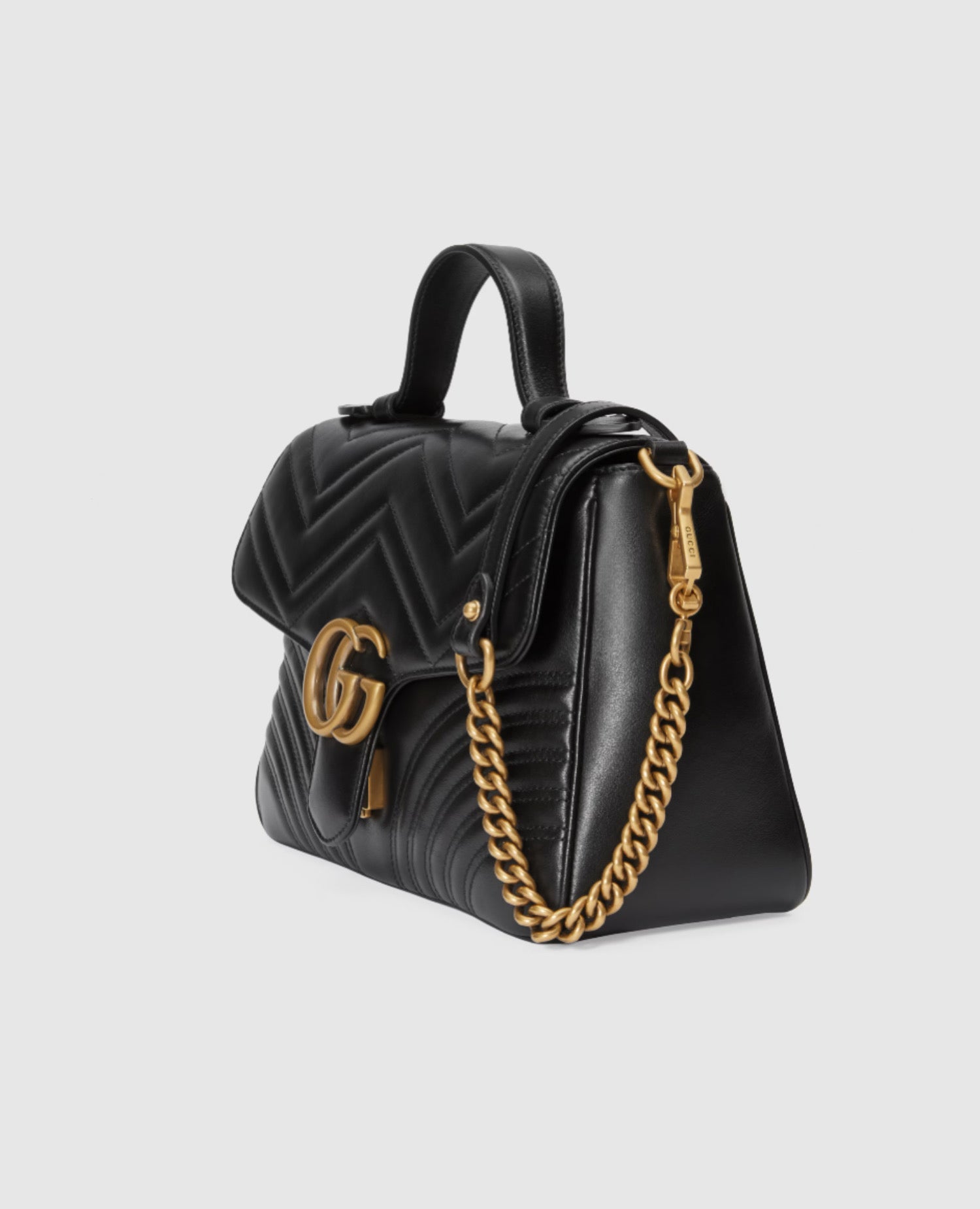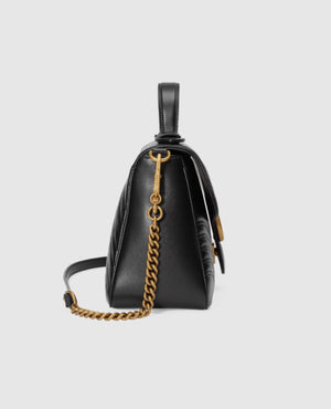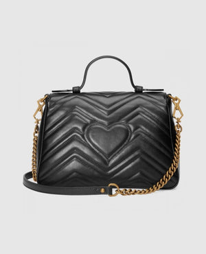 The small GG Marmont top handle bag has a softly structured shape and an oversized flap closure with Double G hardware. Made in matelassé chevron leather with a heart on the back.