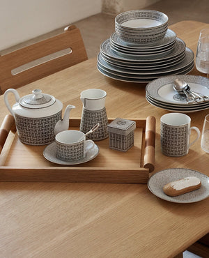 The highly original design codes of the decoration of 24 Faubourg Saint-Honoré in Paris are reproduced in the Mosaic 24 platinum collection through the geometric strips painted by Benoît-Pierre Emery.