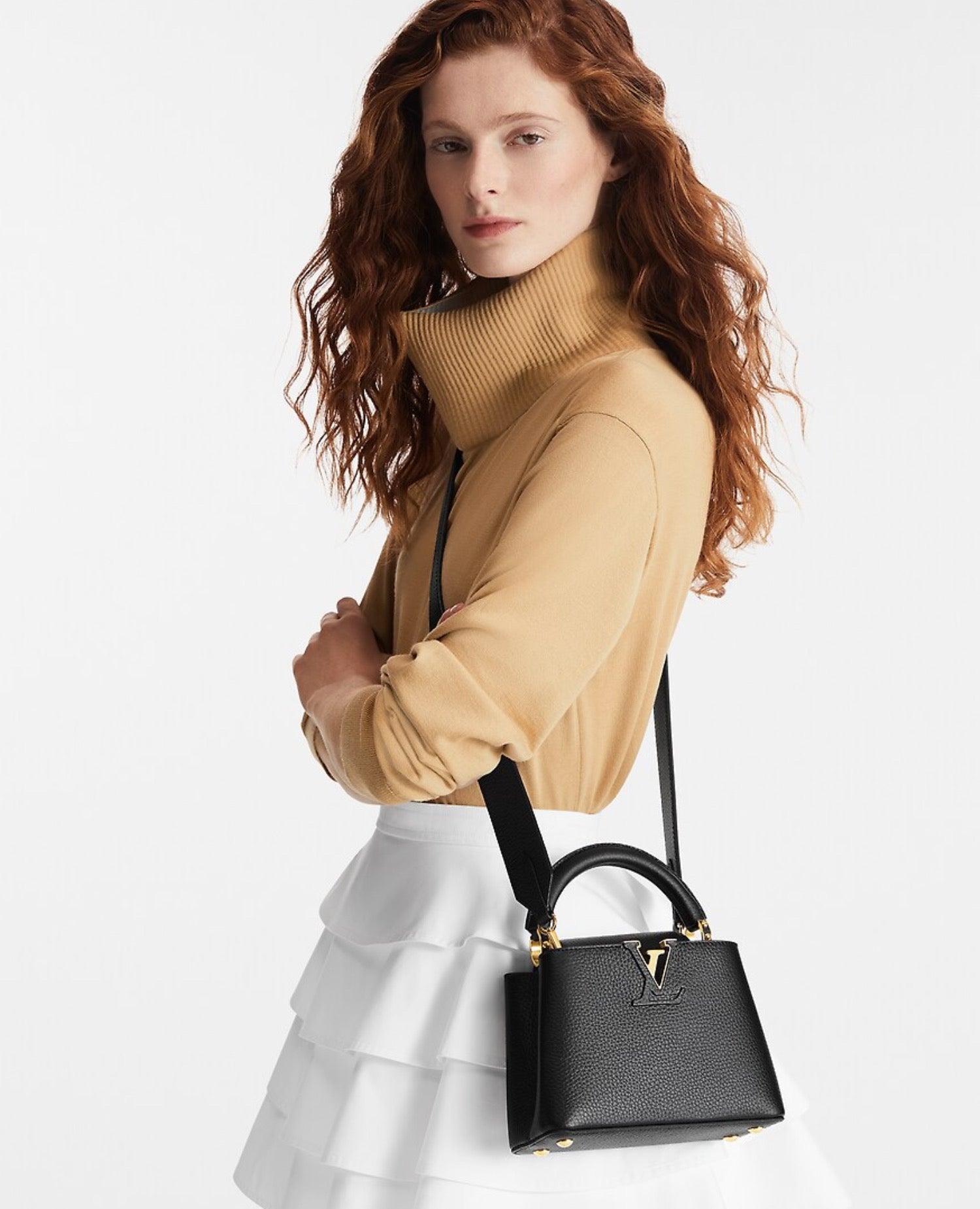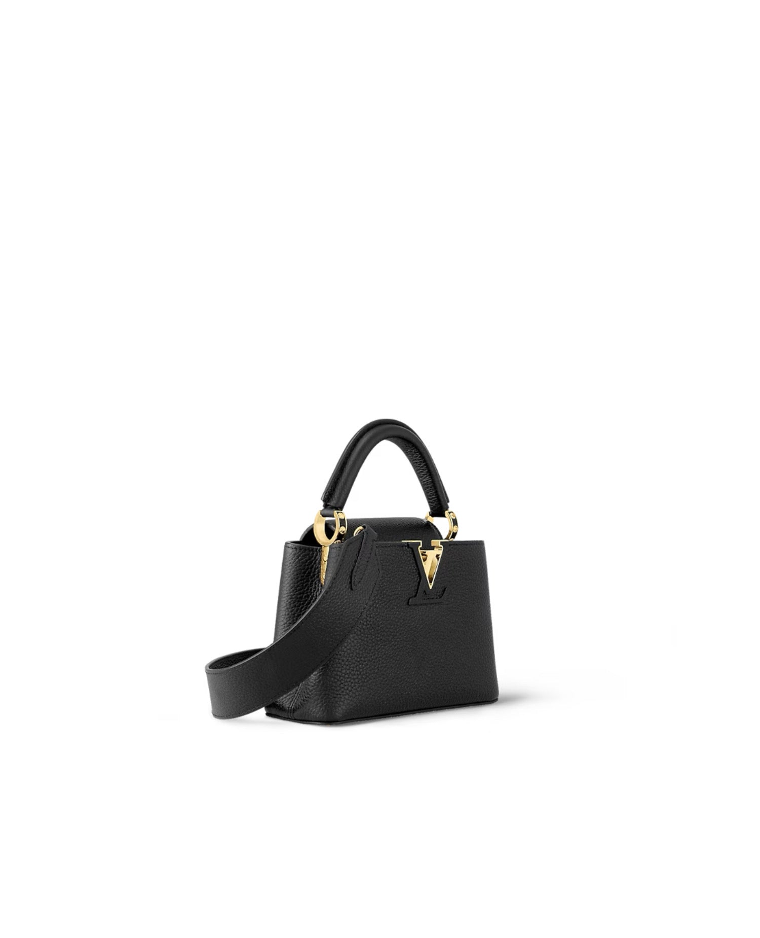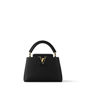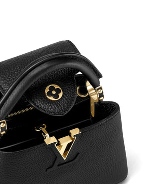 The refined Capucines Mini handbag looks stunningly chic in rich black Taurillon leather finished with golden handle rings and the emblematic LV Initials. This smaller version of the classic Capucines is a pleasure to carry over the shoulder or cross-body thanks to its wide removable strap.