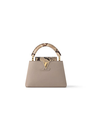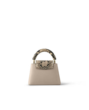 from deep-dyed Taurillon leather and finished with precious python leather on the handle and flap, the Capucines Mini handbag is perfect for any occasion. Whether carried with the top handle or worn over the shoulder thanks to its wide removable strap, the Capucines Mini makes a statement.
