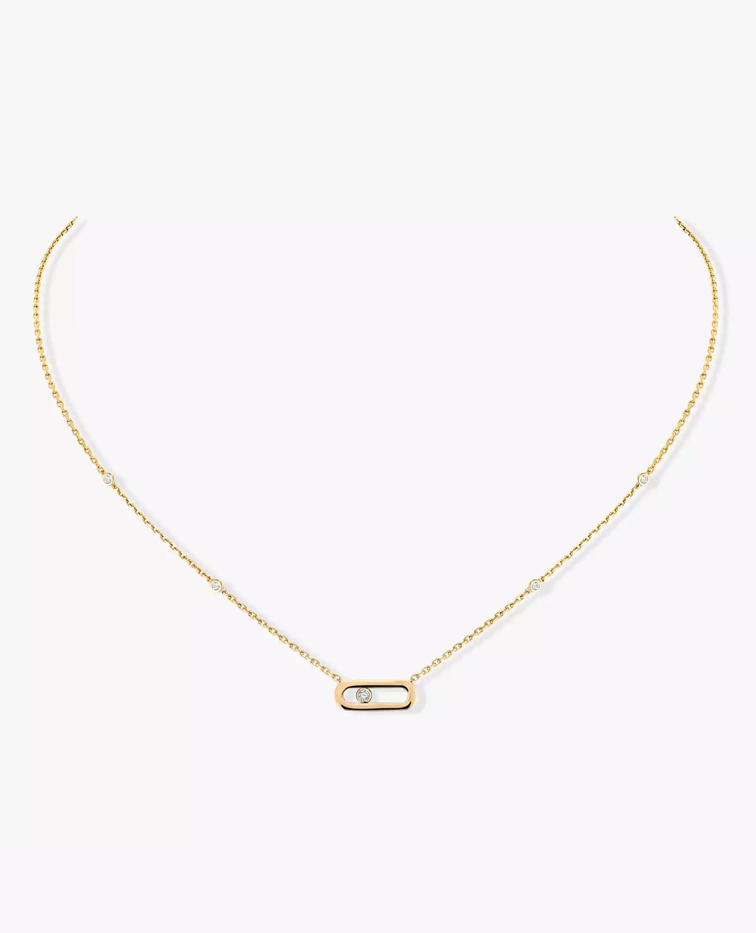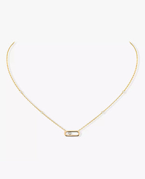 Looking for the perfect gift? The Move Uno diamond necklace in yellow gold is part of the Move collection from the MSK Jewelry and High Jewelry Maison. This iconic collection derives from the moving diamond that slides into its center. Created by hand in 18-carat white gold, we particularly like its adjustable chain set with five other diamonds for a radiant effect. Whether you go for a minimalist look by wearing this diamond necklace on its own, or a more fashionable look by layering it with other creations from the Maison, this women's jewelry piece will quickly become your everyday companion, to accessorise your neckline with a discreet and precious radiance.