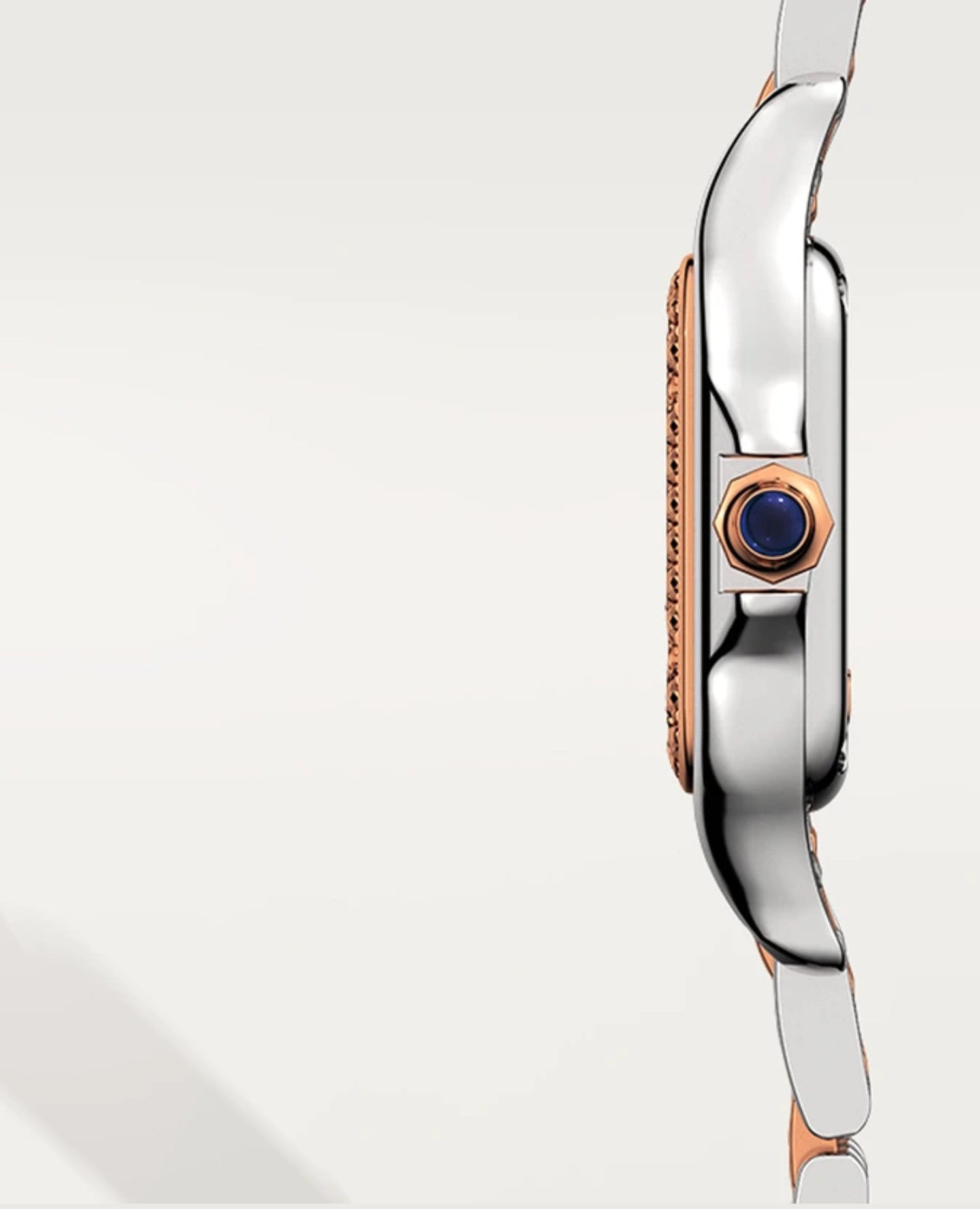 Panthère de CRTwatch, small model, quartz movement. Case in rose gold 750/1000 and steel, bezel set with brilliant-cut diamonds, dimensions: 22 mm x 30 mm, thickness: 6 mm, crown set with a synthetic blue spinel, silvered dial, blued-steel sword-shaped hands, bracelet in rose gold 750/1000 and steel, water-resistant to 3 bar (approx. 30 metres).