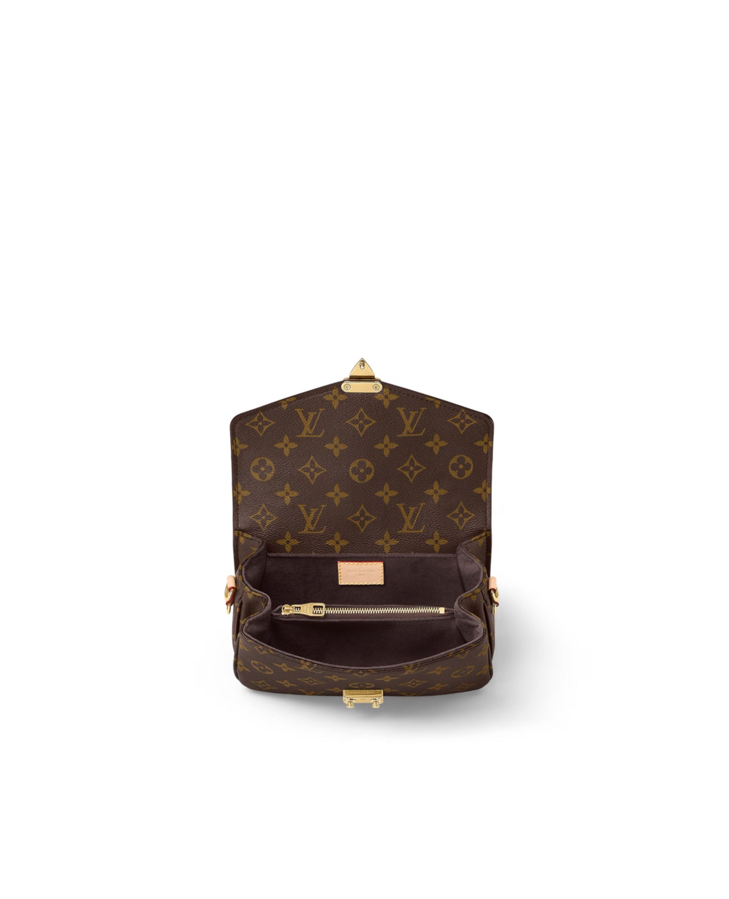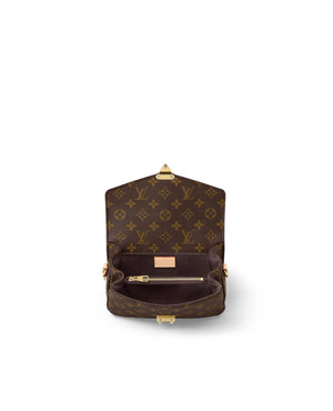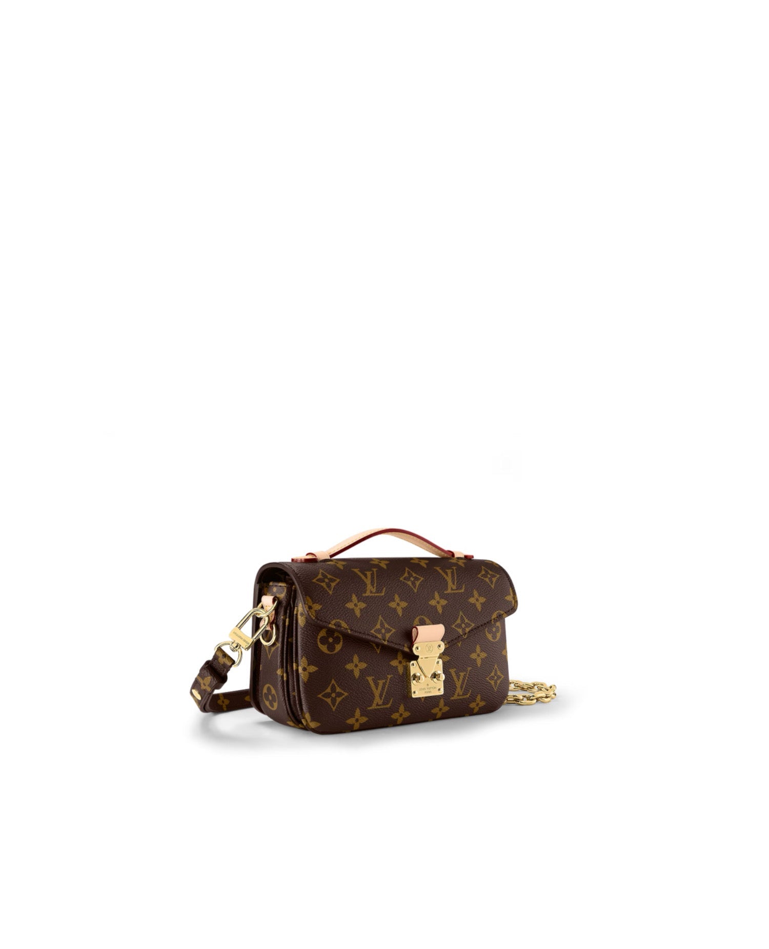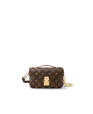 Made from Monogram canvas with natural cowhide-leather trim and the S-lock signature, the Pochette Métis East West bag combines emblematic House cues with new contemporary details like a gold-color chain for fashionable short-shoulder carry. Roomy enough to store an iPhone 13, it has three inside compartments, a zipped pocket inside, and another outside.
