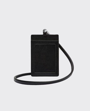 Elegant Saffiano leather badge holder with metal hardware and detachable strap.