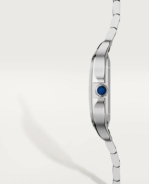 Santos watch, medium model, mechanical movement with automatic winding, calibre 1847 MC. Steel case, 7-sided crown set with a faceted synthetic spinel, silvered opaline dial, steel sword-shaped hands, sapphire crystal. Steel bracelet with “SmartLink” adjustment system. Second bracelet in calfskin, with interchangeable steel folding buckle. Both bracelets are fitted with the “QuickSwitch” interchangeability system. Case width: 35.1 mm, thickness: 8.83 mm. Water-resistant to 10 bar (approx. 100 metres).