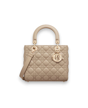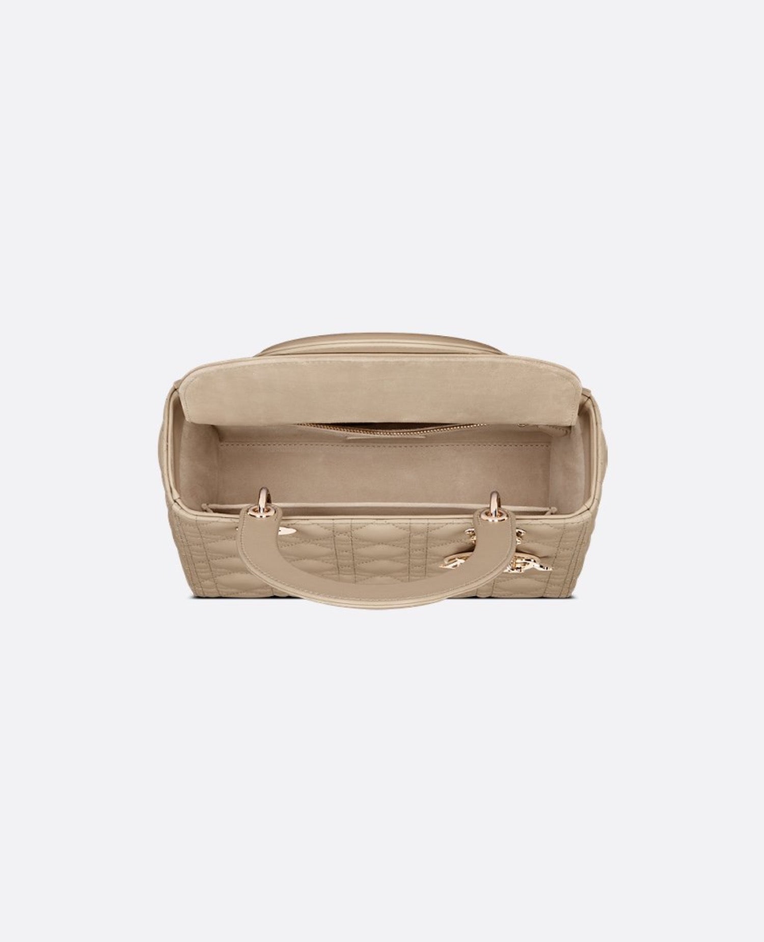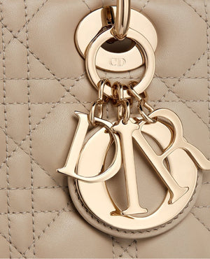 The Lady DR bag epitomizes the House's vision of elegance and beauty. Sleek and refined, the style is timeless. It is crafted in sand-colored lambskin with Cannage stitching, creating the instantly recognizable quilted texture. The pale gold-finish metal D.I.O.R. charms offer an elegant touch. Featuring a thin, removable leather shoulder strap, the medium Lady DR bag can be carried by hand or worn crossbody.