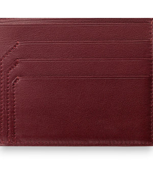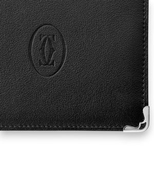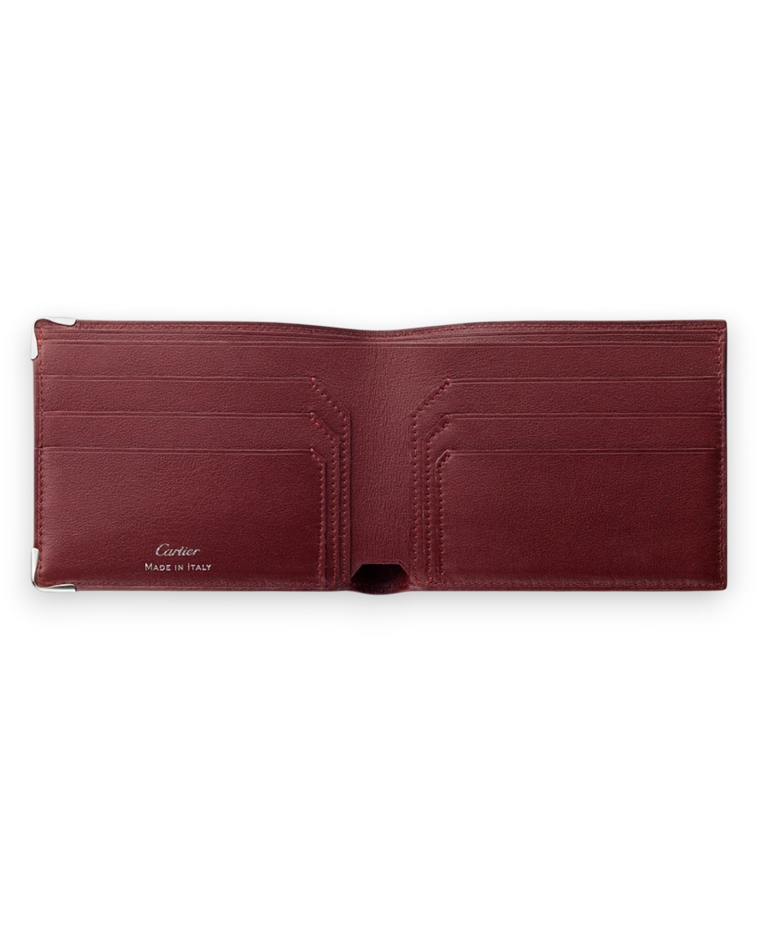 Black calfskin 6-credit card wallet. Exterior: embossed double C logo, stainless steel metal corners. Interior: burgundy calfskin, silver-coloured CRTmarking, six credit card pockets, two banknote pockets. Dimensions: 91 mm high x 119 mm wide.